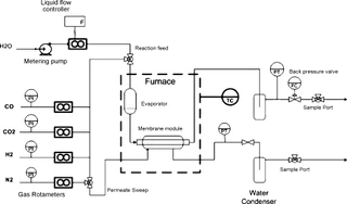Cobalt silica membranes were fabricated using sol–gel techniques for separation of H2 in a membrane reactor set up for the low temperature (up to 300 °C) water gas shift (WGS) reaction. Single dry gas testing prior to reaction showed He/N2 and H2/CO2 selectivities increasing from 75–400 to 45–160 as the temperature increased from 100 to 250 °C, respectively. During reaction the membrane delivered a H2 permeation purity of 89–95% at high conversions, with the higher water ratio conversion providing superior membrane operational performance. Characterisation of bulk gels indicated that the cobalt silica was hydrophilic and exposure to steam at 200 °C resulted in the densification of the film matrix. The cobalt doping allowed for the membrane structural microporosity to be maintained as H2 selectivity was not affected by steam exposure, though the flux decreased due to pore collapse of the film matrix. A total of 8 thermal cycle testing were carried out from room temperature to 300 °C, and the membrane displayed good hydrothermal stability, maintaining a high H2 selectivity for over 200 h of operation.