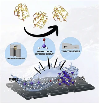 In this study, mono‑hydroxyl polydimethylsiloxane (CH3-PDMS-OH) was successfully grafted onto silica (SiO2) nanoparticles via Steglich esterification process to produce surface-functionalized PDMS-g-SiO₂ nanomaterials. These nanoparticles were then introduced into polyvinylidene fluoride (PVDF) matrices through non-induced phase inversion (NIPS) to fabricate mixed matrix ultrafiltration membranes with different nanoparticle loadings (0, 1.6, 3.2, 6.3, and 11.8 wt %). The PDMS-g-SiO₂ incorporation resulted in membranes with slightly reduced porosity and hydrophobicity compared to pristine PVDF yet exhibited markedly improved antifouling performance. Although pure water flux decreased slightly due to the addition of nanoparticles, the rejection rate of Bovine serum albumin (BSA) improved substantially because of optimized pore structure and surface chemistry. In contrast, membranes containing unmodified SiO₂ showed higher initial flux but suffered from severe irreversible fouling. The modified PVDF membranes showed a flux recovery ratio of up to 97 % and significantly reduced protein adsorption (19.9 µg/cm²) relative to pristine PVDF (62 µg/cm²), confirming the formation of a low-energy, fouling-resistant surface. High flux recovery was sustained over four fouling/cleaning cycles with both BSA and humic acid (HA), and its durability was further demonstrated through 15 days of long-term testing. This study establishes a new hybrid design approach that combines the hydrophobic flexibility of PDMS with the hydrophilic stability of SiO₂, offering a durable and effective route for developing antifouling PVDF membranes for wastewater treatment applications.