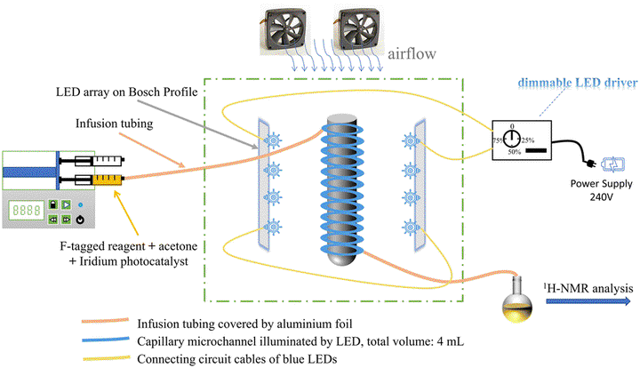 Schematic diagram of the continuous flow test bench for the photocyclization of the F-tagged aniline derivative to the indole product.Abstract