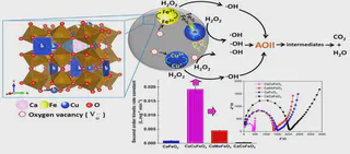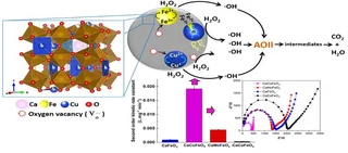 Background: Substitution of different types of B-site metal cations in the perovskite structure led to a significant change in the catalytic reactivity of the resulting catalysts. In this work, the functional role of B-site substitution on the catalytic reactivity of mixed oxides containing B-site substituted CaMFeO3 (M = Cu, Mo and Co) perovskite catalysts is investigated. Methods: The catalysts were synthesized via a modified EDTA-citric acid complexation method and tested for the heterogeneous Fenton-like reaction for oxidative degradation of acid orange II (AOII) dye in the presence of H2O2. Significant findings: CaCuFeO3 exhibited the highest AOII degradation (97%) followed by CaMoFeO3 (90%), CaFeO3 (64%) and CaCoFeO3 (40%) within 60 min of reaction, and the reaction followed a pseudo-second-order kinetics model. Interestingly, the partial substitution of Cu in the B-site of CaFeO3 enhanced the reaction rate constant achieving a k value of 1.9 ×10− 2 L mg− 1 min− 1 , approximately twenty-one times higher than that of the blank catalyst CaFeO3. The enhanced catalytic reactivity of CaCuFeO3 is associated with the high reducibility of copper/iron ions within the B-site structure in the presence of oxidant which facilitated fast redox cycling of the active sites during catalysis. The fast redox cycling is attributed to the decent electron mobility due to low electron transfer resistance between the active sites.