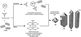A new synthesis method was developed to prepare an aluminum-based metal organic framework (MIL-96) with a larger particle size and different crystal habits. A low cost and water-soluble polymer, hydrolyzed polyacrylamide (HPAM), was added in varying quantities into the synthesis reaction to achieve >200% particle size enlargement with controlled crystal morphology. The modified adsorbent, MIL-96-RHPAM2, was systematically characterized by SEM, XRD, FTIR, BET and TGA-MS. Using activated carbon (AC) as a reference adsorbent, the effectiveness of MIL-96-RHPAM2 for perfluorooctanoic acid (PFOA) removal from water was examined. The study confirms stable morphology of hydrated MIL-96-RHPAM2 particles as well as a superior PFOA adsorption capacity (340 mg/g) despite its lower surface area, relative to standard MIL-96. MIL-96-RHPAM2 suffers from slow adsorption kinetics as the modification significantly blocks pore access. The strong adsorption of PFOA by MIL-96-RHPAM2 was associated with the formation of electrostatic bonds between the anionic carboxylate of PFOA and the amine functionality present in the HPAM backbone. Thus, the strongly held PFOA molecules in the pores of MIL-96-RHPAM2 were not easily desorbed even after eluted with a high ionic strength solvent (500 mM NaCl). Nevertheless, this simple HPAM addition strategy can still chart promising pathways to impart judicious control over adsorbent particle size and crystal shapes while the introduction of amine functionality onto the surface chemistry is simultaneously useful for enhanced PFOA removal from contaminated aqueous systems.