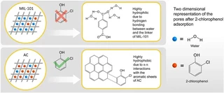 Removal of persistent organic compounds from aqueous solutions is generally achieved using adsorbent like activated carbon (AC) but it suffers from limited adsorption capacity due to low surface area. This paper describes a pioneering work on the adsorption of an organic pollutant, 2-chlorophenol (2-CP) by two MOFs with high surface area and water stability; MIL-101 and its amino-derivative, MIL-101-NH2. Although MOFs have higher surface area than AC, the latter was proven better having the highest equilibrium 2-CP uptake (345 mg g−1), followed by MIL-101 (121 mg g−1) and MIL-101-NH2 (84 mg g−1). Used MIL-101 could be easily regenerated multiple times by washing with ethanol and even showed improved adsorption capacity after each washing cycle. These results can open the doors to meticulous adsorbent selection for treating 2-CP-contaminated water.