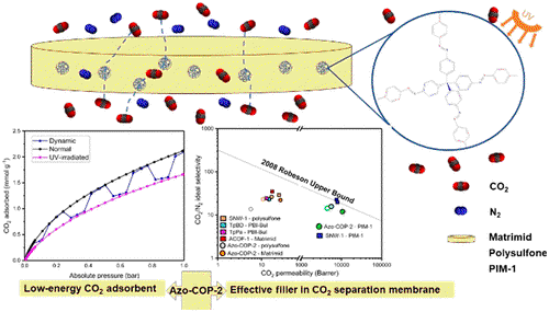 Azo-COP-2 is a nanoporous polymer with exceptional CO2/N2 separation performance. In this study, we further investigate the application of Azo-COP-2 as a low-energy CO2 adsorbent and porous filler in mixed matrix membranes (MMMs) for CO2/N2 separation. As an adsorbent, the UV-irradiated Azo-COP-2 showed lower CO2 uptake than in the nonirradiated state, and Azo-COP-2 also exhibited highly efficient CO2 photoswitching between the two states. Combined with high CO2/N2 selectivity, this makes Azo-COP-2 an excellent candidate for low-energy CO2 capture and release. Azo-COP-2 is also shown to be a beneficial filler in MMMs. For polysulfone-based MMMs, the CO2 permeability and CO2/N2 selectivity could be increased up to 160% and 66.7%, respectively. The strategy shows the great potential of Azo-COP-2 not only for a low-energy CO2 adsorbent but also to improve the performance of conventional polymeric membranes for CO2 postcombustion capture.