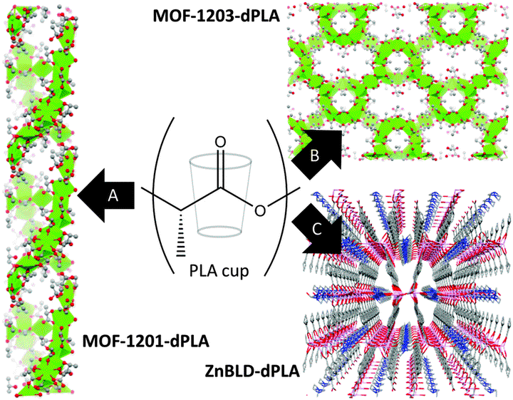 Waste PLA can be upcycled to metal organic frameworks of potential high value in a one-pot synthesis scheme, where PLA depolymerisation occurs in situ. Three homochiral lactate based frameworks were successfully synthesised and characterised from PLA as a feed source, including ZnBLD. The chiral separation ability of ZnBLD was maintained.