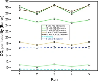 Matrimid-JUC-62 and Matrimid-PCN-250 mixed matrix membranes displaying light-responsive gas separation and beneficial ageing characteristics for CO2/N2 separation