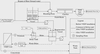 The performance of a vibratory shear enhanced processing (VSEP) unit used to treat waste generated from a magnetic ion exchange (MIEX) process is assessed. The unit was fitted with a NF-270 membrane (97% nominal rejection of MgSO4) with an internal membrane surface area of 37 m2. The vibration amplitude of the module was set at 12.7 mm. The system removes greater than 97% dissolved organic carbon as well as 70 − 85% multivalent solutes (Mg2+, Ca2+, SO42−) from the MIEX waste. The permeate generated was high in salt and was successfully recycled to reduce the brine requirement for MIEX resin bead regeneration. Early operation in recirculating batch mode examined the effect of volumetric recoveries (in the permeate) ranging from 75–85%. Higher recovery had no significant influence on the performance of the system. System chemical cleaning was carried out every 14–16 batches. Batch durations generally extended in each subsequent cycle prior to cleaning, with the last batches taking up to five times longer than the first batch. The installation of VSEP has resulted in a reduced frequency of waste disposal from the facility and has also reduced the amount of make-up brine required for resin regeneration by 78%.