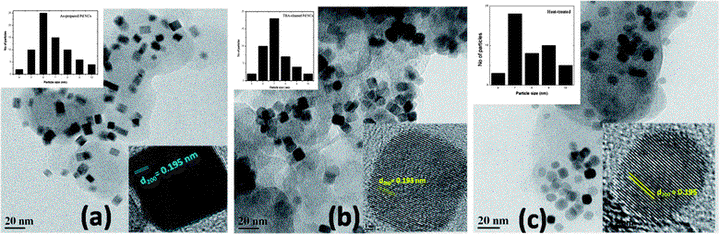Synthesis of shape-controlled nanoparticles of precious metals with defined size is well-established in the literature and the control over shape and size is achieved using surfactants and capping agents. However, a clean surface without impurities is required for realistic applications. In the present investigation, palladium nanocubes are synthesized using poly(vinylpyrrolidone) and potassium bromide. A novel method for cleaning the nanoparticle surface, i.e., treatment with tert-butylamine is reported. For comparison, a part of the untreated sample is subjected to the commonly used method of heat-treatment in an oxygen atmosphere for surface cleaning. The XPS and FTIR spectra of the heat-treated sample show incomplete removal of PVP and complete removal of Br− and the XRD pattern suggests oxide formation on the Pd surface. Treatment with tert-butylamine provides a clean surface free of PVP and Br−. Cleanliness of the surface is further confirmed by the voltammograms and ORR activities in 0.1 M HClO4. We conclude that tert-butylamine can be an effective solvent for the removal of PVP and a reagent for Br− ions because of its ability to form a quaternary ammonium salt.