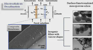 A new type of nanocomposite ion-exchange membranes containing sulfonated polyethersulfone (sPES) polymer matrix and sulfonated surface-functionalized mesoporous silica (SS) inorganic fillers was prepared. Various characterizations revealed that the addition of inorganic fillers with different shapes had a significant influence on the membrane structure. The mesoporous inorganic fillers not only created extra pore and water channels, assisting the ionic migration and improving conductivity of the composites, but also provided additional fixed charge groups upon surface modification. This allows the Donnan exclusion to work effectively and thus improve the selectivity of membranes. It was proved that the incorporation of appropriate amount of SS additive could significantly improve the conductivity (up to 20 folds) and permselectivity (about 14%) of the sPES membranes. The performance of these newly developed membranes in desalination by electrodialysis was comparable with that of a commercial membrane (FKE).